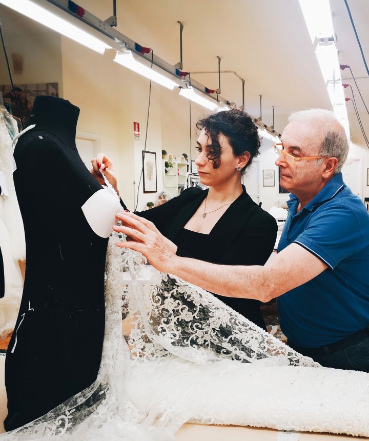 E’ curioso guardare alle nostre origini: il fondatore Giorgio seguì nel dettaglio l’abito da sposa della sua Rosa, la donna che lo affiancò solo più tardi nel progetto Fiori d’Arancio Atelier.
