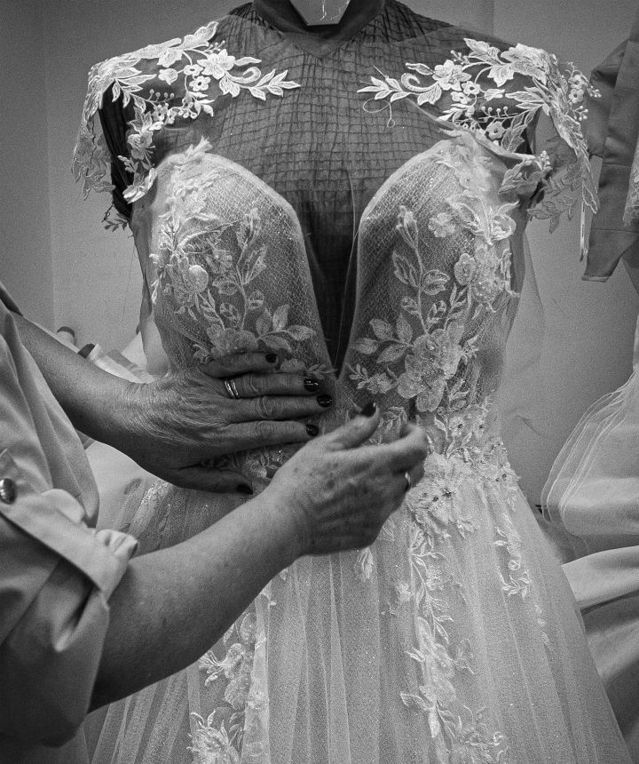 Scegli tra la vasta scelta di tessuti di alta qualità, pizzi di tutti i tipi e ricami fatti a mano.