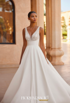 Abito da sposa lungo, taglio voluminoso. Realizzato in mikado con corpetto ricamato con perline, scollo profondo e schiena a V.