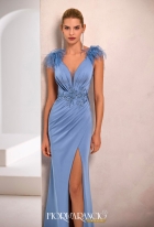 Sinuoso abito a sirena morbido con scollo a V e applicazioni di piume sulle spalle. Gonna drappeggiata con spacco e applicazioni di pizzo tono su tono in vita. Abito disponibile al campione
