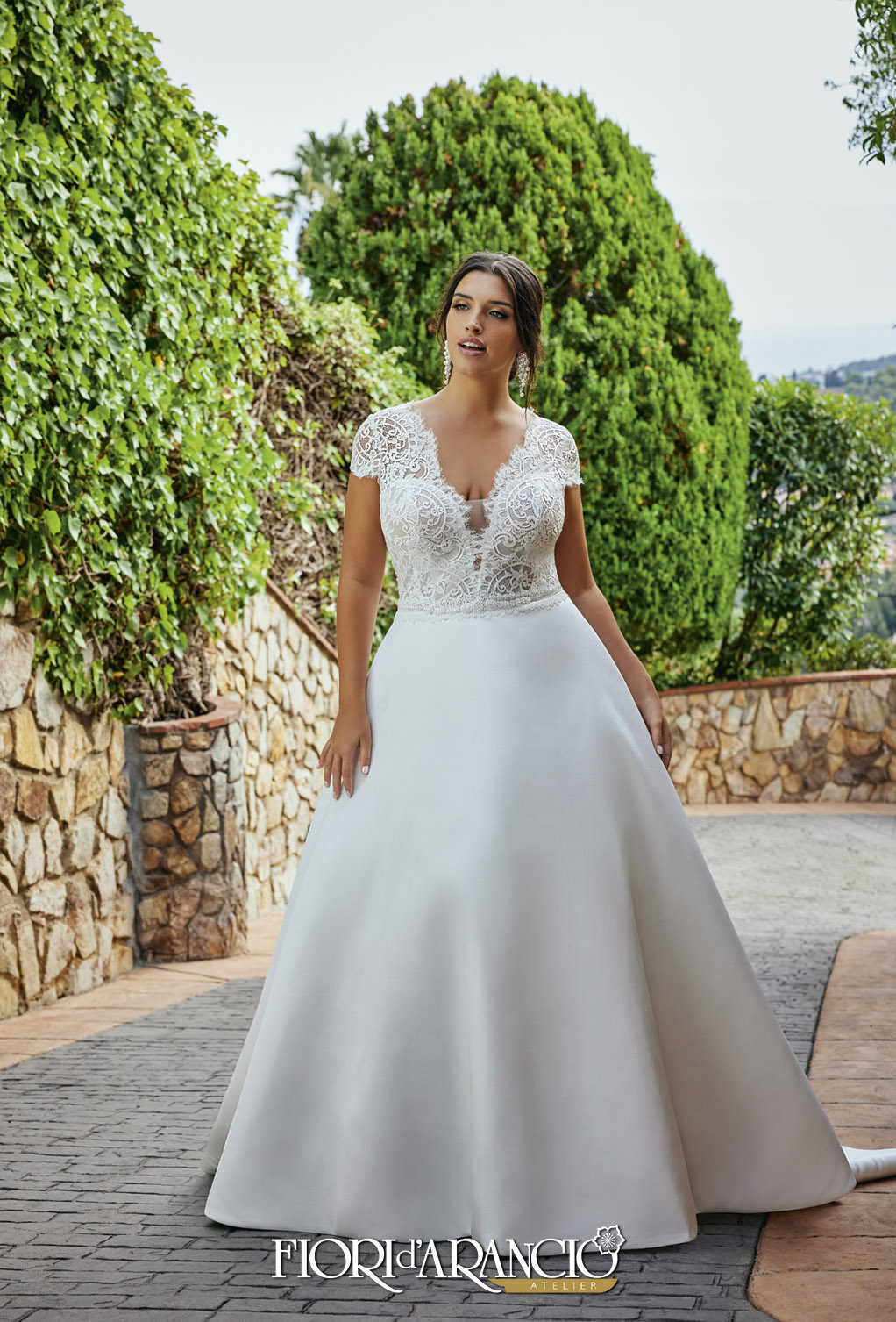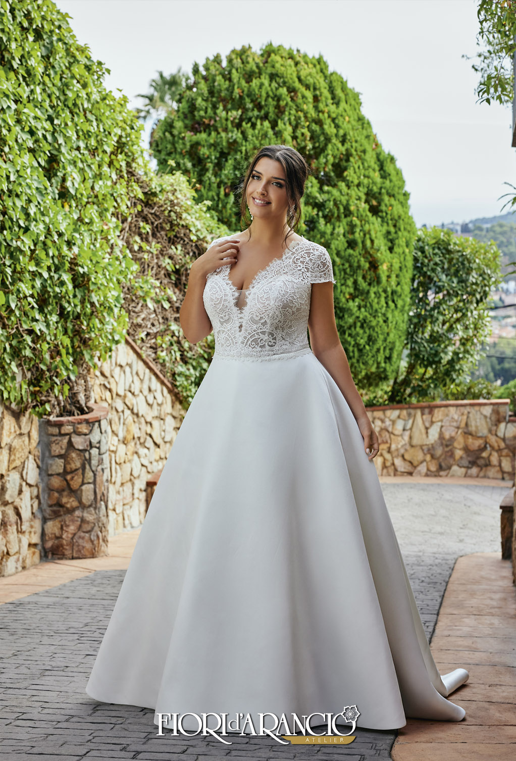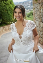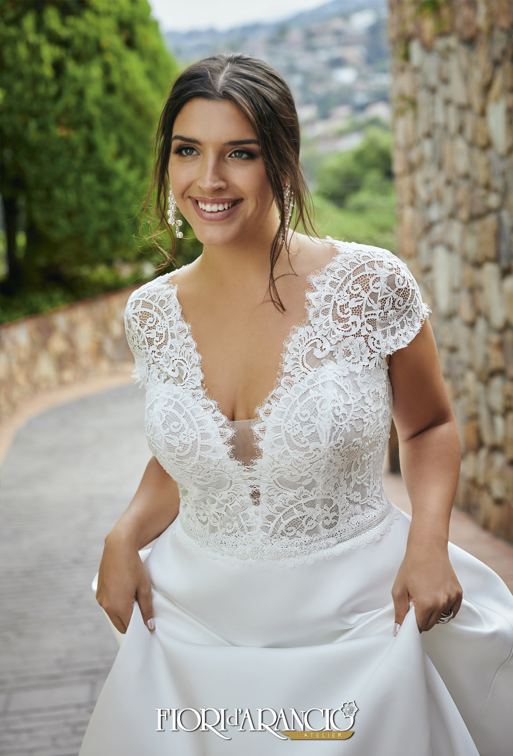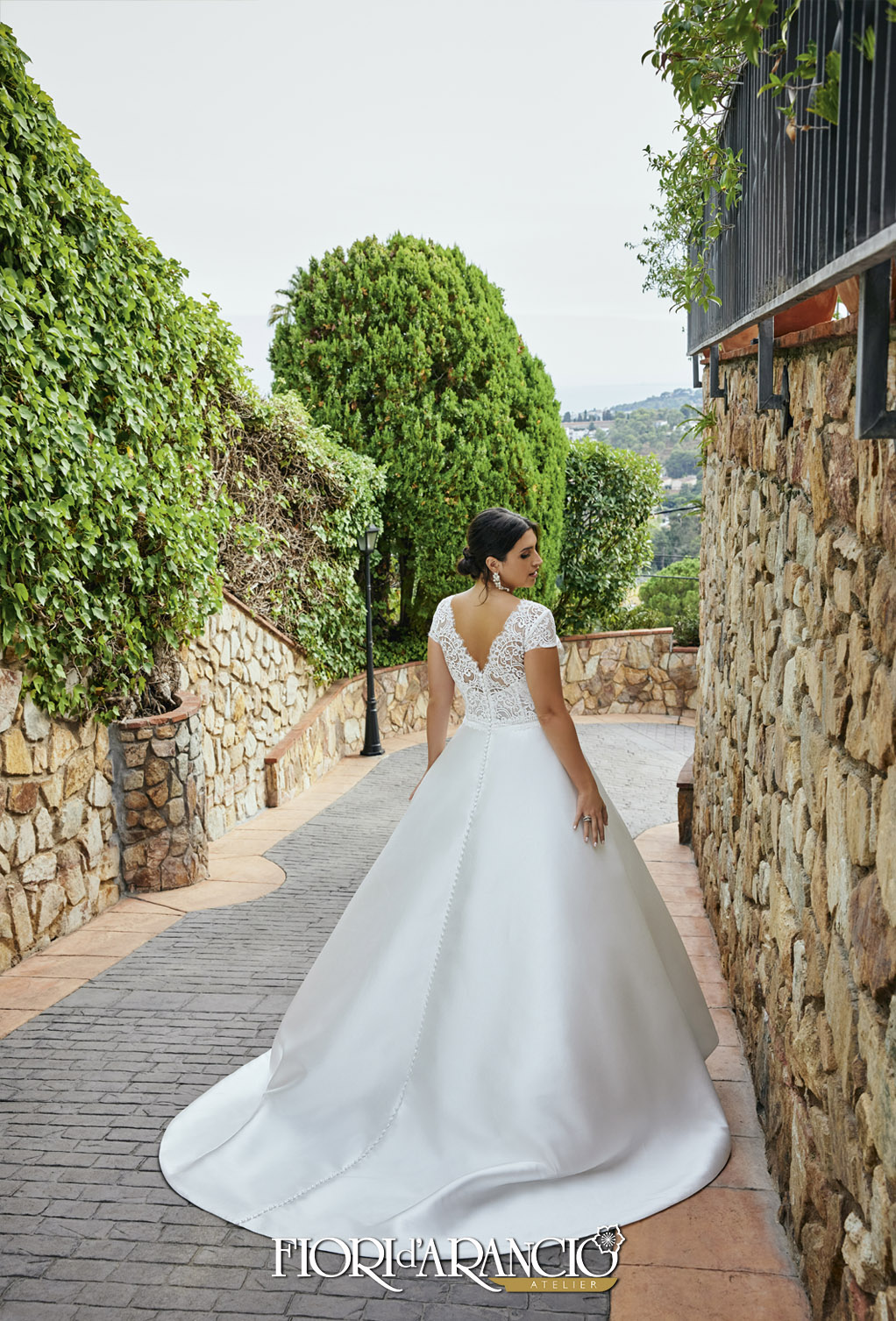 Regale abito in mikado con corpetto in pizzo rebrodato e scollo a v profondo smerlato con manichine corte. Il punto vita è esaltato da una cintura ricamata con una lunga coda in mikado.