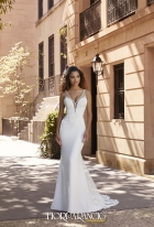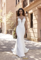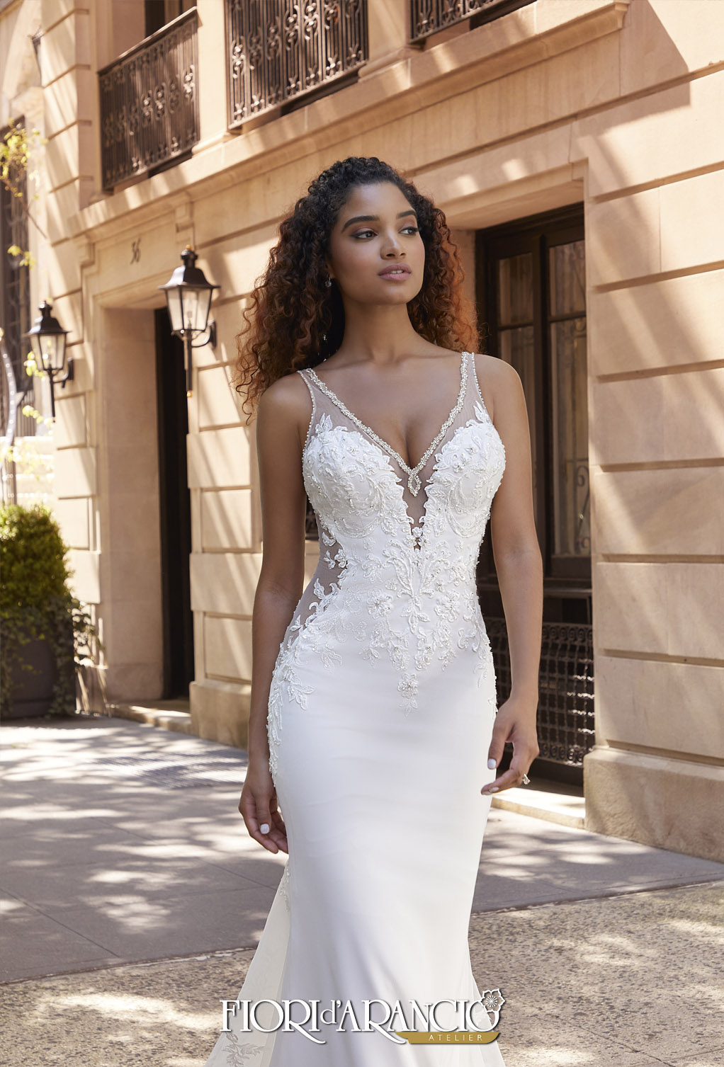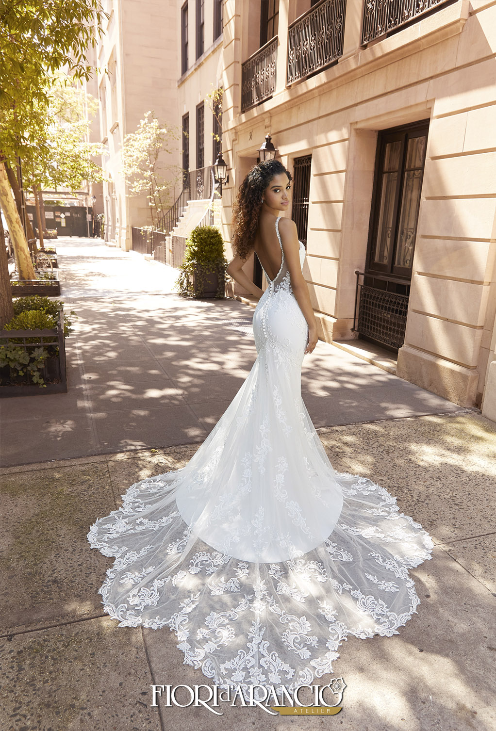 Preziosa sirena in crepe con corpetto in pizzo rebrodato ricamato con spalline in trasparenza che presentano i profili con cristalli. Dietro la scollatura è profonda su una trasparenza che prosegue sul fianco. La coda è importante, a forma di petali, con pizzo in trasparenza.