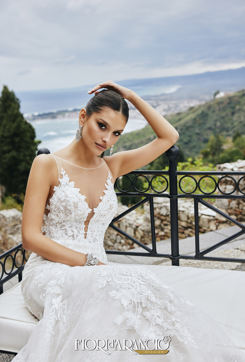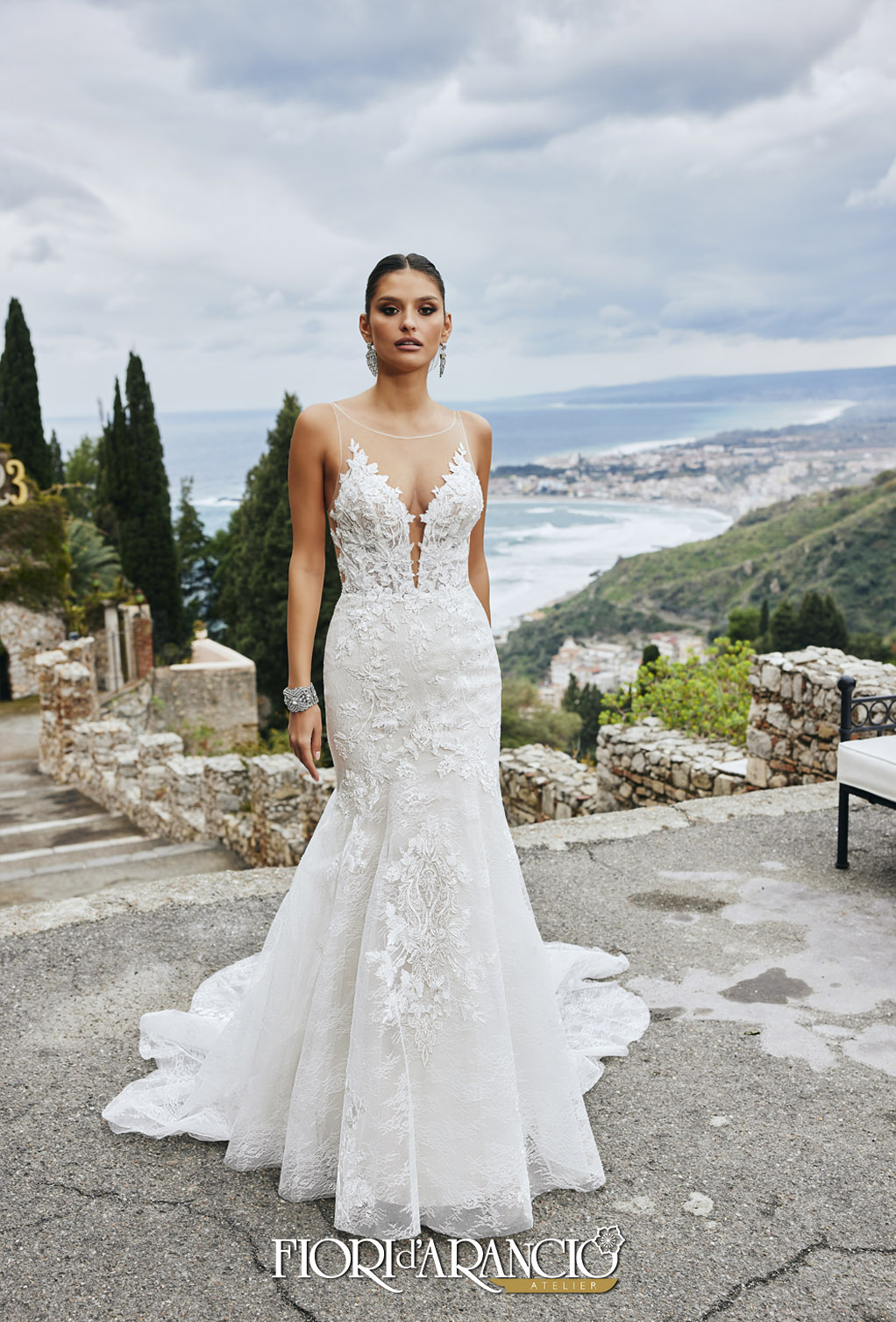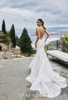 Sinuosa sirena in pizzo francese con applicazioni sparse di pizzo macramè ricamato su tutto l’abito. La scollatura a v è realizzata su una trasparenza di tulle. Dietro la scollatura è molto profonda e la trasparenza prosegue sui lati del corpetto. La gonna è lunga e a forma di petali.