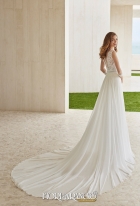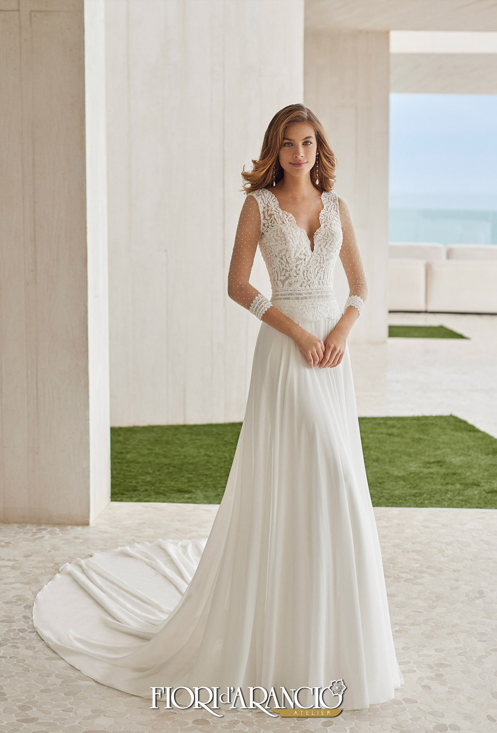 Un delicato abito scivolato in georgette e pizzo con maniche tre quarti per una sposa sobria ed elegante. Un corpetto in pizzo ricamato finemente tono su tono on scollatura a V smerlata e maniche in tulle pois d’esprit a tre quarti. Il punto vita è segnato e la gonna scende morbida in georgette. Dietro la scollatura stupisce con il suo pizzo in trasparenza e la chiusura con bottoncini foderati.