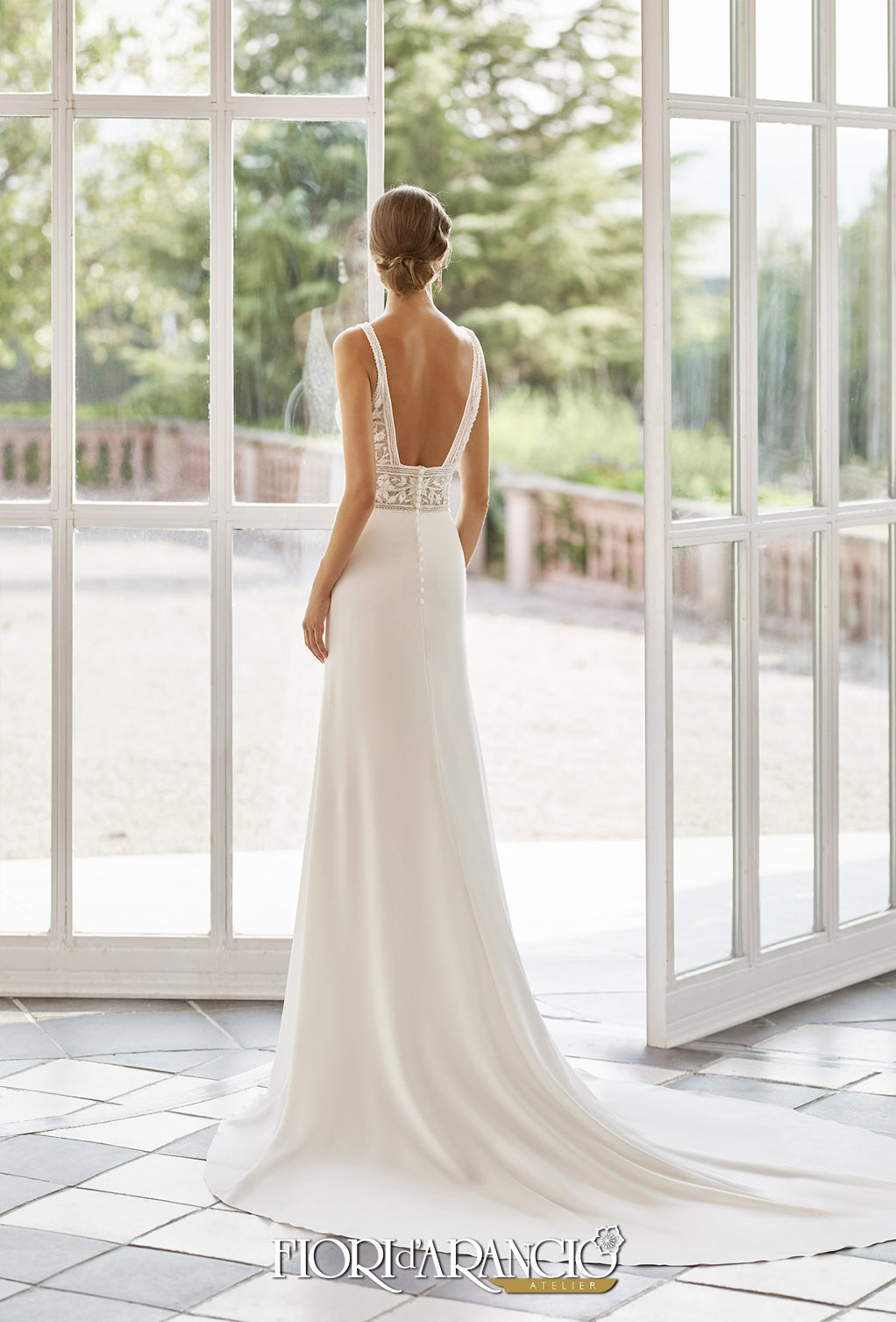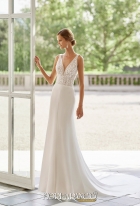 Una nuova collezione Rosa Clarà si affaccia nel mondo della sposa regalando atmosfere liberty e anni venti. È la nuova collezione Gatsby che prende lo stile glamour e scintillante del mood. Oria è un abito a sirena morbida con corpetto ricamato con elementi tono su tono che ricorda i motivi floreali liberty. La gonna accarezza i fianchi e scende morbida stupendo con un taglio centrale che crea movimento. Dietro la scollatura è moderna, quadrata. La coda è lunga.