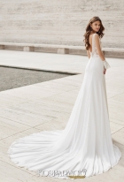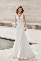 Un abito a trapezio decisamente fuori dal comune con un corpetto in pizzo chantilly con scollatura a V smerlata e maniche lunghe in trasparenza costituite da un grazioso tulle pois d’esprit. Il particolare polsino dona carattere alla manica regalando un tocco chic. Punto vita segnato e una gonna a trapezio che cade sinuosa sul terreno accarezzando fianchi e cosce.