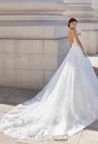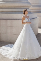 Abito A-line in pizzo con una scollatura a V profonda sul davanti e anche dietro. Spalline sottili e ricamate e corpetto sfoderato. Il punto vita è leggermente più basso allungando la figura notevolmente. La schiena è scoperta ampiamente rivelando uno scollo a V costituito dalle spalline.