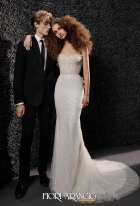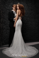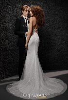 Abito in tulle bianco sporco cosparso dalla testa ai piedi di paillettes luccicanti. Corpetto aderente a corsetto con stecche visibili e drappeggio lusinghiero sulla linea del busto. Una gonna a coda di pesce e un punto vita definito creano una silhouette morbidamente sensuale. Un abito da star decisamente per una sposa che non vuole passare inosservata, perfetto per la sera.